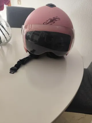 Casco de moto estilo scooter en color rosa. Cuenta con una visera transparente y un diseño moderno.