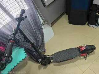Patinete eléctrico con un diseño deportivo y llamativo. - Color principal negro con detalles en rojo. - Estructura robusta y manillar ajustable. Solo tiene suelto un cable que hay que arreglar por eso su precio