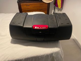 Conjunto de tres baúles Shad para maxi scooter. - Baúl superior rojo y plateado. - Dos baúles laterales plateados. - Suporte de baul