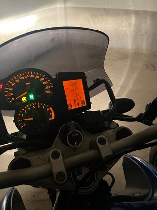 Moto BMW R 1200 R del año 2008. - Asiento de cuero gris. - Maleta trasera negra. - Escape plateado.