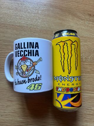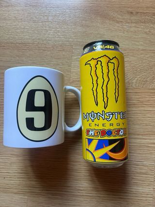 Conjunto de taza conmemorativa del 9º título mundial de VR46 y una lata de Monster Energy sin abrir.