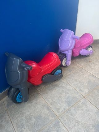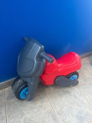 Moto de juguete para niños, con un diseño inspirado en una motocicleta. - Color principal rojo. - Detalles en gris. - Ruedas azules.