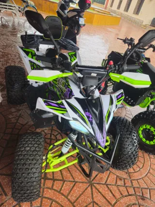 Cuatrimoto eléctrica semi nueva. Funciona 100% a batería, silenciosa y ecológica, perfecta para uso recreativo en patios, fincas o terrenos privados, para adultos y niños, vel 50km/h aprox. 🔋 Motor eléctrico (sin gasolina) 🛞 Llantas todoterreno con excelente agarre 🪑 Asiento cómodo y diseño resistente 🧱 Estructura fuerte con protectores laterales 🎨 Diseño deportivo en color negro con detalles verdes 📦 Parrilla trasera para carga ligera Muy fácil de manejar, estable y segura para aprender. 5 meses de uso 📍 Lista para usar 📸 La que ves en las fotos 💬 Elche