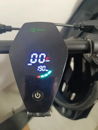 Patinete eléctrico marca Youin, modelo XL3, en color negro. Diseñado para desplazamientos urbanos. - Logo de la marca Youin visible. - Botón de encendido/apagado. - Indicador de velocidad y odómetro. -km 190 En exelente estado