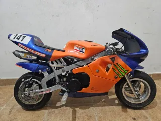 Minimoto de gasolina con un diseño deportivo y llamativo. Funcionando perfectamente. - Colores principales: azul y naranja. - Estilo de moto deportiva.