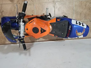 Moto hecha de cero a capricho. Parte interna motor: piston,cigueñal completo,rodamientos,retenes.. Parte ciclo: Suspensiones y amortiguador cambio de aceites y retenes,sin revalvulado. Está como en origen. Chasis pintado al horno,tijas,llantas y bujes. tambien algunas partes con pintura de ceramica como carteres y semicarter,,bombas de freno..etc Tapas Boyesen. Neumaticos nuevos. Kit de transmision. Escape pro-circuit platinum Caja laminas v force Manillar renthal Plastica nueva Manetas reversibles apico Manguitos de silicona...etc Se daria recambios y manual del usuario. La vendo por poco uso. No negociable.