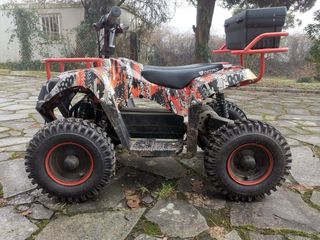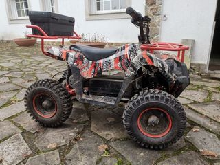 Mini quad eléctrico con un potente motor de 1000W y batería de 36V. - Diseño deportivo con detalles en rojo y negro. - Ruedas todoterreno para mayor tracción. - Incluye portaequipajes delantero y trasero. Comprado en zimadistribucion