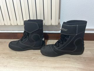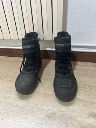 Botas ProBiker para moto (Talla 45), fabricadas en tejido antiabrasión y con protecciones rígidas de kevlar en suela, puntera y laterales/tobillo. Cierre con cordones y velcro para dejarlos fijos y que no bailen. Mucho más cómodas y ponibles para usar en el día a día. Color gris oscuro (sale algo raro en las fotos). Están en perfecto estado, ninguna caída. #biker #motorcycle #custom #trail #naked #protección #safety #seguridad #coche
