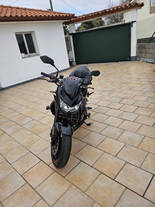 Moto Kawasaki estilo naked en color negro. - Diseño deportivo y ágil. - Manillar ancho para un mejor control. - Espejos retrovisores integrados.
