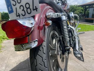 Moto estilo cruiser Suzuki Intruder 800cc. Un clásico para disfrutar de la carretera. - Motor potente y fiable. - Diseño icónico con detalles cromados. - Asiento cómodo para el piloto y pasajero. - Maletas laterales de cuero con remaches. - Parabrisas para mayor protección. - Respaldo para el pasajero.