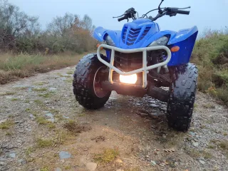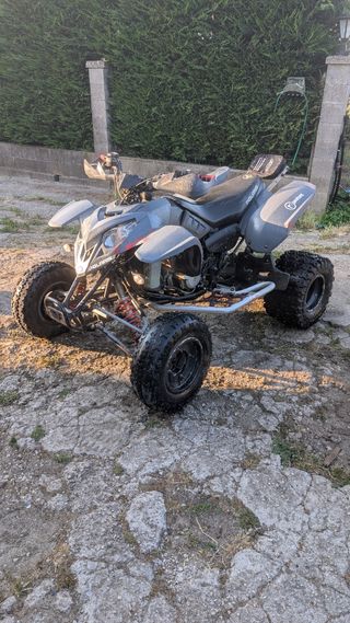 Quad 350 dos plazas matrícula blanca, automático, marcha atrás, con itv hasta octubre 2026. Varios extras: separadores delante y detrás, foco led con interruptor independiente, puños calefactables, sensor de temperatura con pantalla, línea de escape (entregaría de serie para itv), protector, mantenimientos recién hechos, rodamientos buje recién cambiados. Muy cuidado solo tiene algún plástico roto.