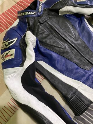 Chaqueta de motorista Berik de estilo deportivo. - Utilizado 2-3 veces. - Talla 38. - Original y homologado. - Diseño en color azul, blanco y negro. - Material de cuero hidratado. - Cierre de cremallera frontal. - Puños ajustables con cremallera.