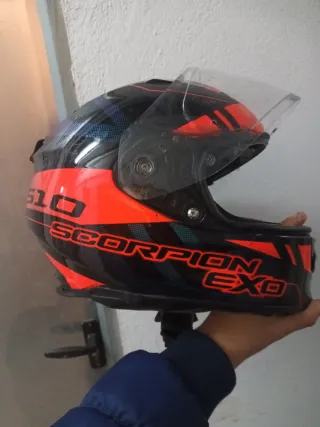 Casco de moto Scorpion con diseño llamativo. Tiene algunos rallones por que se me callo al suelo por lo demás esta perfecto - Exterior con acabado brillante. - Interior acolchado para mayor comodidad. - Visera transparente.