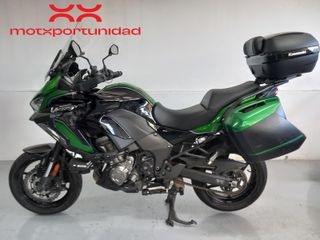 Moto Kawasaki Versys 1000 SE en color verde y gris. Diseñada para aventuras y viajes largos. - Diseño deportivo y robusto. - Maletas laterales incluidas. - Top case trasero. - Parabrisas ajustable. - Bateria de Litio - Maleta extra lateral nueva a estrenar.