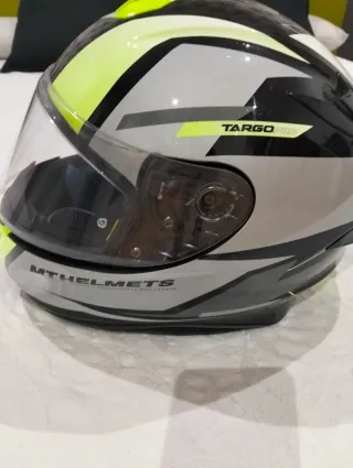 Casco de moto con un diseño moderno y llamativo. - Acabado exterior en gris y detalles en amarillo. - Fabricado en polímero resistente a impactos.