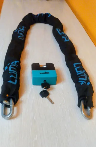 Candado con cadena de la marca LUMA, en perfecto estado y con un solo uso. - Longitud 150 CM. - Grosor islabon 10 mm. - Ancho islabon 35 mm - Color negro y azul. - Incluye dos llaves. NO HAGO ENVIOS