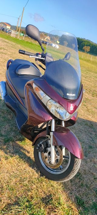Suzuki Burgman 125 en color negro. lleva desde principios de año parada por no usar, habría que pasarle la ITV pero la pasa sin problema, neumáticos al 70% de vida, puños y batería nuevas, correa, rodillos y embrague del variador cambiados en noviembre del año pasado (no hizo 400km desde que se le hizo). Le cuesta arrancar en frío, habría que carburarla para que arranque bien, una vez que arranca ya arranca bien siempre y funciona correctamente