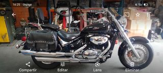Motocicleta Suzuki VL250 Intruder en color negro. - Diseño cruiser. - Asiento doble. - Maletas laterales de cuero. - Espejos cromados. -16000 kilómetros -batería nueva - motor sellado