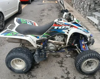 Quad Suzuki LTZ 400 con un diseño deportivo y llamativo. - Decoración personalizada con logos de Suzuki, Fox, Red Bull y otros. - Neumáticos de carretera, le falta itv y mantenimiento por eso ese precio