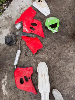 Vendo moto todoterreno Suzuki menos el chaiss con asiento azul. - Rueda trasera con llanta de radios. - Escape plateado. - Depósito de combustible rojo.no Ranca tené problema de lpiston