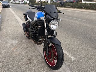 Suzuki SV650, limitada a A2 en papeles. Parabrisas Ermax, escape GPR. También conservo el escape original, un portamatrículas corto y un baul Shad para dos cascos. La moto es muy fácil de limitar y delimitar. Aceite y filtro cambiados hace 1000 km. ITV hasta septiembre de 2027 19 000 km. La moto está en perfecto estado; el único problema es que el indicador de combustible no lo indica (problema común en las SV650 de 3.ª generación).