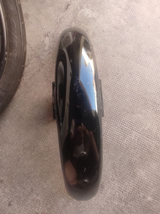 Se venden dos accesorios para motocicleta Harley Davidson. El conjunto incluye un bolso lateral de cuero negro, con hebilla, en buen estado y un guardabarros delantero también negro, que presenta algunas marcas de uso. - Bolso de cuero para motocicleta Harley Davidson. - Guardabarros delantero para moto, color negro.