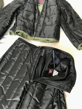 Ambos con forro desmontable. Protección de hombros, codos y rodillas. Todo el conjunto prácticamente nuevo (se ha llevado 2 veces). Talla 46 (italiana, para mujer normal de alrededor de 1,65m). Espero ofertas