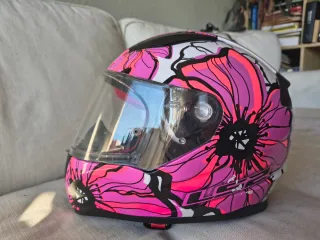 Casco de moto con un llamativo diseño de flores en tonos rosas y blancos. - Diseño floral vibrante. - Visera transparente.