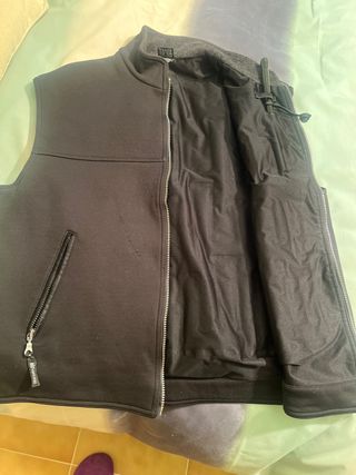 Chaleco negro para motorista con detalles de válvula para aislamiento termico. Talla:M Medidas: 120 cms. Contorno de pecho de pecho y 65 cms. De largo - Diseño para motoristas. - Cremallera frontal. - Bolsillo con cremallera lateral.