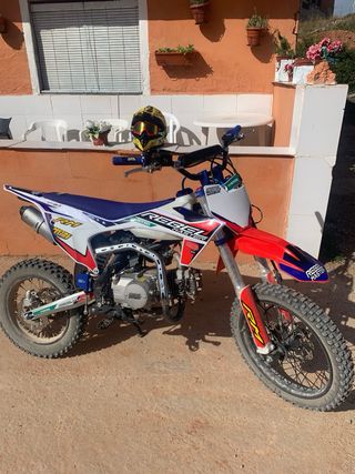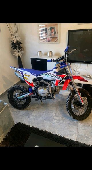 Pit bike de 125 cc, ideal para disfrutar en terrenos. - Diseño en azul y blanco. - Ruedas de tacos Va perfecta lo unico que esta un poquillo fea de pintura de estar sin usarse. Única pega que el freno de atras no funciona, por lo demas perfecta. Carbulador a estrenar