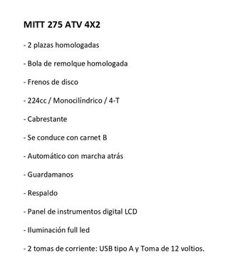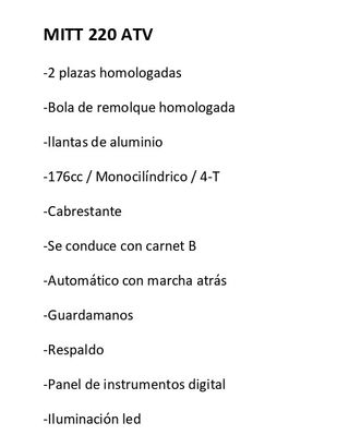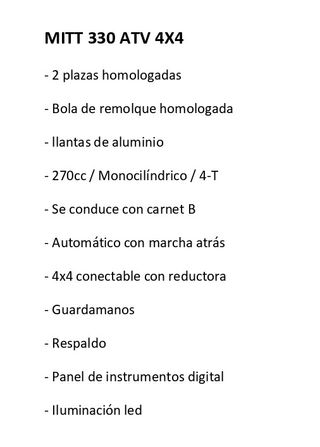 - Somos concesionario oficial CFMoto, Segway, Linhai, Odes, Goes, Mitt de QUAD, ATV, UTV, BUGGY - Disponemos de todos los modelos Mitt - Transporte a domicilio disponible (consultar precio) - Financiación disponible desde 50€/mes - Iva deducible para profesionales - 3 años de garantía. - Los vehículos no inscritos en el ROMA pueden estar sujetos a liquidación del 14,75% de Impuesto de Matriculación y Emisiones. Polaris Can-Am Honda Linhai Yamaha.Kawasaki Loncin Suzuki Cf-Moto Bombardier Kymco Segway Mitt Arctic Cat Odes Tgb