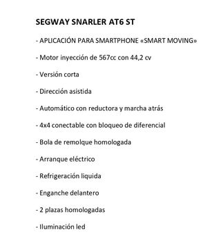 - Somos concesionario oficial Segway, Odes, Linhai, CFMoto, Goes, Mitt de QUAD, ATV, UTV, BUGGY - Disponemos de todos los modelos Segway - Transporte a domicilio disponible (consultar precio) - Financiación disponible desde 165€/mes - Iva deducible para profesionales - 3 años de garantía - Matrícula agrícola - Posibilidad de matricular como cuadriciclo (matrícula blanca) en 11360€ - Los vehículos no inscritos en el ROMA pueden estar sujetos a liquidación del 14,75% de Impuesto de Matriculación y Emisiones. Polaris Can-Am Honda Linhai Yamaha.Kawasaki Loncin Suzuki Cf-Moto Bombardier Kymco Segway Mitt Arctic Cat Odes Tgb
