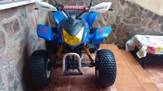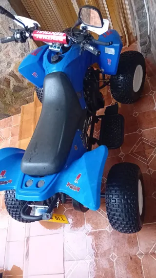 Quad infantil de 50cc en color azul. - Diseño deportivo. - Ruedas todoterreno. - Manillar con protecciones. Con su documentación en regla a falta de itv funciona perfectamente le funciona todas las luces