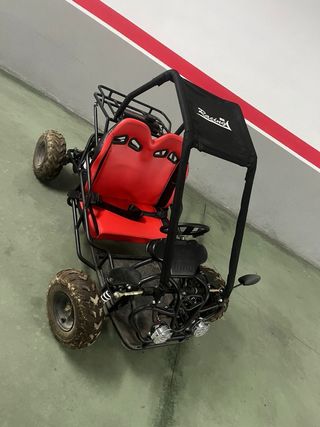 Buggy infantil de 125cc, automático con marcha atrás, para peques con edades comprendidas de 5 a 12 años de edad. Este modelo incluye focos led para una optima visibilidad en horas donde cae la noche. Medidas interior buggy: Del acelerador al respaldo del asiento 75cm Del freno al respaldo del asiento 65cm Asiento al techo 80cm Poco uso , 10 horas.