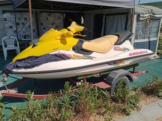 Se vende moto de agua Sea-Doo GTI de 2 tiempos. Averiada lleva una raja que toma aire se ve en la foto (soldada con soldadura en frio) Estado actual motor arrancada fuera del agua a falta de ajustar carburador y probar en el agua Centralita nueva Sergementos nuevos Carburador revisado y se da otro usado Regulador nuevo Batería nueva Remolque sin papeles y para revisar No le meto más dinero, para un manitas que quiera terminarla También cambio por algo interesante pagando diferencia - Modelo: Sea-Doo GTI - Motor de 2 tiempos - Color amarillo y blanco