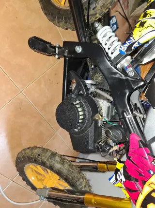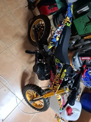 Mini moto de cross con un diseño llamativo y deportivo. Esta Usada 1 vez Juego de ptotecciones Casco y guantes Y peto protector de espalda Todo costo 400 y esta sin usar - Ruedas todoterreno. - Llantas doradas. - Decoración personalizada.