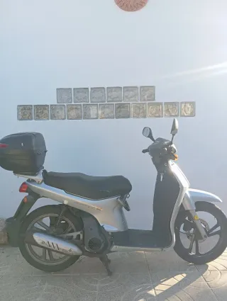 Scooter Piaggio Typhoon 50cc 2T.Año 2006. 6.600km reales, estuvo hasta el año pasado parada en el garaje de la casa de pueblo y me la traje el año pasado con 4.700km. Se le hizo revisión completa, se le a puesto neumaticos nuevos (95%), correa, cambios de aceite y filtros . Esta completamente nueva, solo tiene una rascada en la placa lateral y el retrovisor derecho me lo robarón y lleva uno que me regalaron aunque no es de esta moto pero hace el apaño. Siempre en garaje. Itv hasta septiembre 2026. Pegatina medioambiental amarilla B.