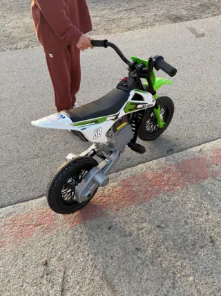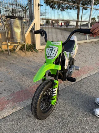 Moto eléctrica infantil con diseño deportivo y número 68. - Nueva solo la a usado dos veces para probar pero no le gustó, por ese motivo la vendo. -Lleva ruedines -Tiene musica - Corre 8km/h - Color verde y blanco. - Ruedas todoterreno. - Precio en el mercado 150€( mínimo). Negociable