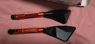 Set de retrovisores para moto en color naranja. Nunca han sido usados. - Diseño angular moderno. - Acabado en aluminio y plástico. - Medidas aproximadas: 26cm (largo total), 13.5cm (largo del brazo), 12.5cm (ancho del brazo), 11cm x 5.8cm (espejo).