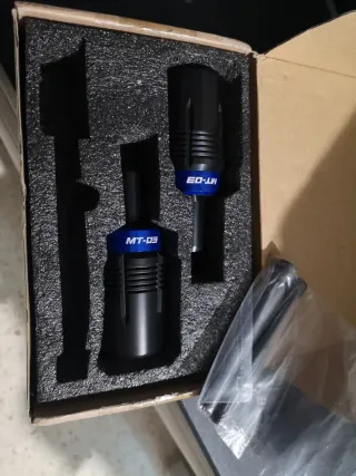 Set de topes anticaída para Yamaha MT-03. Diseñados para proteger tu moto en caso de caída. - Fabricados en aluminio y plástico resistente. - Color negro con detalles en azul. - Incluye tornillería para su instalación.