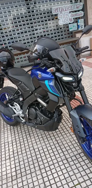 Moto Yamaha MT-125 en llamativo color azul y negro. Un modelo ágil y deportivo. - Diseño agresivo y moderno. - Faro delantero LED distintivo. - Ruedas de aleación con detalles en azul.
