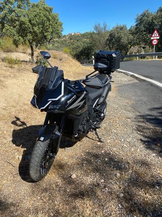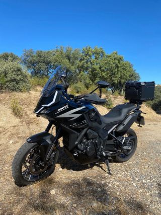 Moto Zontes en color negro, lista para tus aventuras.3600 kilómetros - Diseño trail y moderno. - Incluye baúl trasero para almacenamiento adicional.