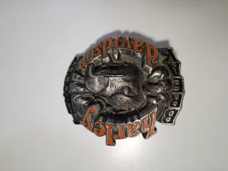 Hebilla de la marca Harley Davidson con un diseño llamativo. - Diseño con un animal en el centro. - Detalles en color naranja y plateado.