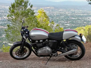 Moto Triumph Bonneville t100 del 2013, etiqueta.transformada a estilo café racer. Neumático más ancho, escapes Tor, manillar bajo, piñon más grande para llanear mejor. Mejor ver y oír. Todas las piezas originales, así tienes dos motos, una bonneville y una thruxton. Aceptaría cambio por vehículo mismo valor con etiqueta medioambiental.