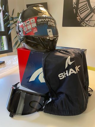 Casco de moto Shark Spartan RS en talla L. Diseño moderno y seguro. - Material exterior de fibra de carbono. - Visera clara. - Cierre de doble anilla.