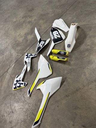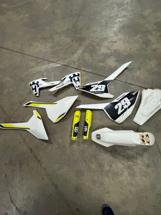 Kit de plásticos para motocross Husqvarna de los años 2016 a 2018. Incluye varias piezas para personalizar o reemplazar las originales. - Plásticos blancos y negros con detalles en amarillo. - Incluye adhesivos con el número 29. - Logo de Husqvarna presente en varias piezas.