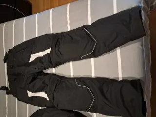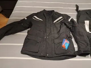Conjunto de cazadora y pantalón para moto en color negro. Ideal para equiparse para rutas. - Cazadora con 2 bolsillos frontales. - Detalles reflectantes en mangas y espalda. - Cinturones ajustables en cintura y mangas. - Pantalón con detalles blancos y negros. Con protectores por todo. La cazadora y el pantalón se unen. Está sin estrenar. Talla XL