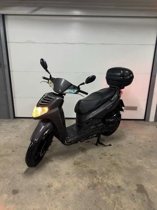 Moto scooter SYM 125 en color negro y gris. Ideal para moverse por la ciudad con agilidad. 31500km - Baúl trasero incluido. - Espejos retrovisores. - Rueda delantera y trasera.