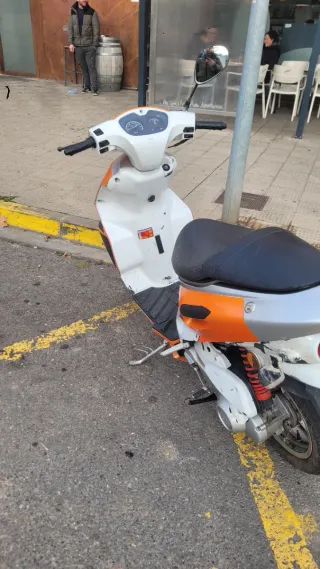 Scooter de dos plazas en colores naranja y blanco. Ideal para moverse por la ciudad. - Diseño moderno. - Asiento cómodo. La moto tiene el motor echo nuevo la moto tiene itv itv asta el 2027