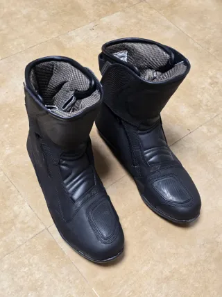 Botas de moto de la marca SHINA modelo TERRA, de hombre, de cuero negro, diseñadas para ofrecer protección y comodidad. - Cierre con cremallera y velcro. - Protecciones en tobillo y puntera. - Interior acolchado para mayor confort. - Botas de alta gama y alta calidad. - Talla 46. Yo suelo gastar en deportivos una 45 o 45,5 (pero como se suele decir, en botas de moto tienes que elegir una talla más que en otros calzados). Son botas que nuevas se suelen costar entre 120 y 150 euros. No han sido usadas.